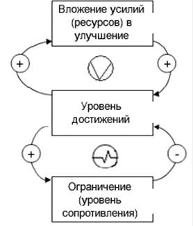 Вначале - чем больше усилий, тем лучше результат. Чем лучше результат, тем больше прилагается усилий в этом направлении. Но затем путь к успеху преграждает некий барьер (ограничение), который проявляется тем сильнее, чем значительнее успех.