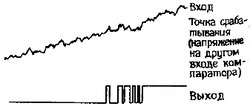 · При медленно изменяющемся входном сигнале напряжение на выходе также может изменяться достаточно медленно. · Более того, если во входном сигнале присутствует шум, то на выходе может происходить дребезг в те моменты, когда напряжение на входе проходит через точку переключения.