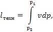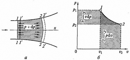 Рис. Внешняя работа движущегося газа (а) и графическое изображение технической работы на p - v диаграмме (б) По аналогии с работой расширения можно получить, что теплота, подводимая к движущемуся телу (пару или газу), dq = du + dlпр + dlкин, где du – изменение внутренней энергии; dlпр – изменение работы проталкивания; dlкин – изменение кинетической энергии. Уравнение является аналитическим выражением первого закона термодинамики для потока газа. Изменение кинетической энергии потока называют его технической работой lтехн = Δlкин. Из уравнения первого закона термодинамики после ряда замен и преобразований получаем dlкин = - υdp (знак минус указывает на уменьшение объема при росте значений давления). В итоге полная техническая работа, совершаемая в процессе 1 – 2,