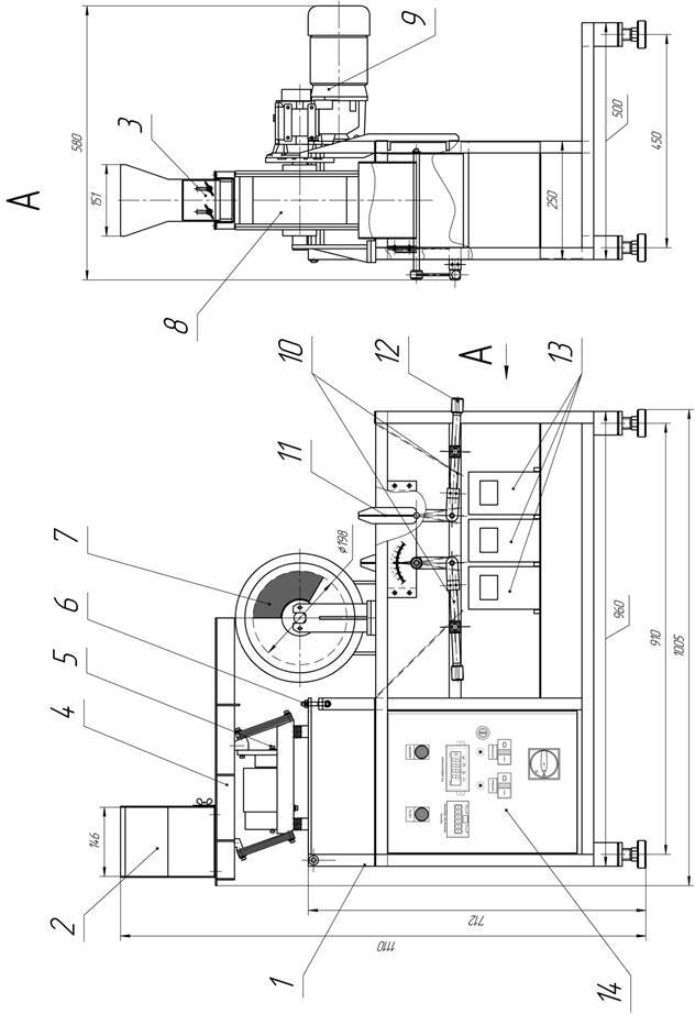 1.5 Нажатием кнопки SB2 «Пуск барабана» включить вращение барабана, при этом включается световой индикатор HL3 «Барабан»; 1.6 Потенциометром R1 на пульте управления установить необходимую скороть вращения барабана, частота контролируется на панели управления преобразователя частоты VLT 2800 (А1); 1.7 Подать продукт на вибропитатель. 1.8 Нажатием кнопки SB4 «Пуск вибропитателя» включить вибропитатель при этом включается световой индикатор HL4 «Питатель»; 1.9 Потенциометром R2 блока управления вибропитателя ЭМ-68 (А3) установить необходимую скороть подачи продукта, величина тока электромагнита контролируется амперметром MT4W-AA-4N (А2); 1.10 Остановка сепаратора производится в обратном порядке нажатием кнопок «Стоп вибропитателя» SB3 и «Стоп барабана» SB1. 1.11 Защиту от перегзузки электродвигателя барабана осуществляет преобразователь частоты. При срабатывании защиты отключаются электродвигатель и вибропитатель и включается световой индикатор HL2 «Авария». Для возврата схемы в рабочее состояние необходимо устранить причину перегрузки и сбросить аварию преобразователя частоты нажатием кнопки «STOP RESET» на панели управления преобразователя частоты VLT 2800; 1.12 Направление вращения обечайки барабана выбирается переключением тумблера SA2 «Направление вращения»; 1.13 Включение вибропитателя возможно только после включения вращения барабана. 1.14 Категорически запрещается: ― попадание вместе с продуктом в бункер сепаратора металлических примесей (болты, гайки, окалина и др.); ― подавать на сепаратор продукт температура которого выше 60ºС; ― в процессе эксплуатации сепаратора запрещается изменение параметров преобразователей частоты без согласования с предприятием изготовителем сепаратора.