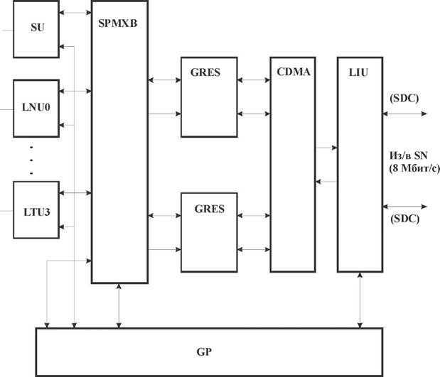 Линейные группы D (LTGD) Контроллер коммутационной группы (SGCI) Контроллер коммутационной группы с канальным интерфейсом для взаимодействия с буфером сообщений (SGCI) имеется только в ступени емкости SN:15LTG. В его состав входит SGC и интерфейс с контроллером Часть 3. Цифровая коммутационная система EWSD аппаратных средств модуля LIM. Соответствующие функции аналогичны функциям SGC и LIM. 3.1.5 Линейный модуль Общее описание линейных групп (LTG) Линейные группы (LTG) сетевого узла представляют собой интерфейс между линиями доступа (абонентскими линиями, соединительными линиями и т.д.) и коммутационным полем (SN). Группы LTG могут поддерживать все процессы сигнализации, в ходе которых используются подключенные к этим группам линии. Они имеют собственные контроллеры, таким образом, освобождают координационные процессоры (CP) от регламентной работы. Это означает, что группы LTG выполняют локальные задачи управления, такие как прием информации о набранном номере, запись стоимости разговора, наблюдение за линией и т.д. Существует несколько разновидностей LTG: - LTGD - LTGF - LTGG - LTGH - LTGM - LTGN LTG в системе EWSD расположена в функциональной области "Доступ" Линейная группа D (LTGD) позволяет выполнить соединения со следующими линиями: - первичными цифровыми линиями связи (PDC) - аналоговыми соединительными линиями Характеристика LTGD: - более низка потребляемая мощность - возможность гибкого изменения объемов памяти на узле - более высокая надежность - современная технология; специализированные интегральные схемы (ASIC) Линейная группа D (LTGD) делится на следующие функциональные блоки (Рис. 1.10): - групповой процессор (GP) - блок канальных интерфейсов между LTG и SN (LIU) - речевой мультиплексор (SPMXB) - вторичный сетевой мультиплексор (SDMA) - сигнальный блок (SU) - кодовый приемник, эхо-подавитель (CRES) - блок подключения линий (LTU)