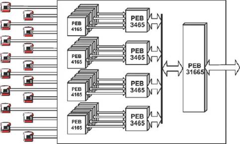 - микросхема абонентского комплекта MuSLIC PEB4166; - счетверенный кофидек PEB3465 (QAP); - схема управления 16-ю комплектами MuSLIC PEB31666 (MuPP); - цепи защиты от перенапряжений (терморезисторы, защитные диоды); - схема самотестирования; Часть 5. Цифровая коммутационная система MC240 - мультиплексор для измерения напряжений на линии. Состав схемы управления