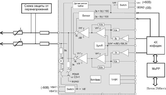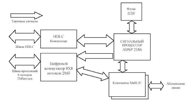 Схема управления модуля состоит из следующих узлов: - ядро на базе сигнального процессора ADSP-2186; - флэш-ПЗУ программ; - контроллер протокола HDLC; - коммутатор выхода на промлинии. Общие принципы функционирования Работа модуля основана на периодическом опросе схемой управления состояния датчиков тока абонентских комплектов и накоплении результатов опроса. Анализируя накопленные данные, схема управления распознает следующие действия абонента: - снятие трубки; - набор номера, в т.ч. набор DTMF (используется сигнальный процессор); - короткий отбой; - отбой. Информация о действиях абонентов накапливается, а затем, по запросу, отправляется центральному процессору (ЦП) для дальнейшей обработки. На рисунке 4 приведена упрощенная принципиальная схема одного из 16 абонентских комплектов. Основными элементами являются: схема защиты от перенапряжений, прецизионные резисторы, терморезисторы и микросхема сопряжения с абонентской линией (Subscriber Line Interface Circuit = SLIC). Сигнал с разговорного тракта снимается с датчиков тока, кодируется счетверенным кофидеком (QAP) и упаковывается в поток 2 Мбит/с.