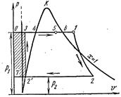 На pv- диаграмме точка 4 характеризует состояние кипящей воды в котле при давлении p1. Линия 4-5 изображает процесс парообразования в котле; затем пар подсушивается в перегревателе при давлении p1. Полученный пар по адиабате 1-2 расширяется в цилиндре парового двигателя до давления p2 в конденсаторе. В процессе 2 – пар полностью конденсируется до состояния кипящей жидкости при давлении p2 , отдавая теплоту парообразования охлаждающей воде. Процесс сжатия воды осуществляется в насосе; получающееся при этом повышение температуры воды ничтожно мало, и им в исследованиях при давлениях до 3,0 – 4,0 МПа пренебрегают. Линия 3-4 изображает изменение объёма воды при нагревании от температуры в конденсаторе до температуры кипения. Работа насоса изображается заштрихованной пл. 03 7. Энтальпия пара при выходе из перегревателя в точке 1 равна i1 и на Ts –диаграмме изображается пл. 9 34617109. Энтальпия пара при входе в конденсатор в точке 2 равна i2 и на Ts –диаграмме изображается пл. 9. Энтальпия воды при выходе из конденсатора в точке равна i1 и на Ts –диаграмме изображается пл. 9 8109. Полезная работа пара в цикле Ренкина l изображается на pv- диаграмме пл.. Если в цикле Ренкина учитывать работу насоса, то процесс адиабатного сжатия воды в нём представится на Ts- диаграмме адиабатой, а изобара 3-4 соответствует нагреванию воды в котле при давлении p1 до соответствующей температуры кипения. Термический КПД цикла Ренкина определяется по формуле: