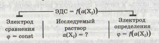 Например, редокс-потенциал электрода, на котором протекает процесс MnO4- + 5е + 8 H + ⇄ Mn2+ + 4Н2О определяется уравнением: Потенциометрией называется физико-химический метод анализа, позволяющий определять активности (концентрации) ионов на основании измерения ЭДС гальванической цепи, состоящей из электрода сравнения и электрода определения, опущенных в исследуемый раствор.