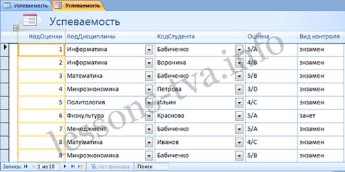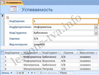 Рис. 2. Если Access обнаруживает одну таблицу, связанную отношением «один-ко-многим» с таблицей или запросом, который использовался для создания формы, Access добавляет таблицу данных в форму, основанную на связанной таблице или запросе. Если таблица данных в форме не нужна, ее можно удалить. Средство "Разделенная форма". Разделенная form — новая возможность в Microsoft Access 2007, которая позволяет одновременно отображать данные в режиме формы и в режиме таблицы. В области объектов (переходов) выделить таблицу, например Успеваемость. Далее щелкнуть на пиктограмме "Разделенная forms" на вкладке Создать. На экране будет отображена form (3).