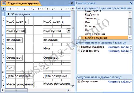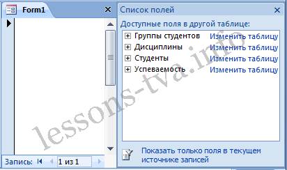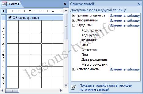 Рис. 7. Конструктор форм. Для создания новой пустой формы Студенты необходимо выполнить следующее: 1. В окне приложения Access 2007 выбрать вкладку Создание. Выполнить щелчок на пиктограмме "Конструктор форм". В окне редактирования появится окно Form1 с пустой областью данных. 2. Для отображения списка полей требуемой таблицы выполнить щелчок на пиктограмме "Добавить существующие поля", появится список таблиц. Щелкнув на знак "+" таблицы (например, Студенты), откроется список необходимых полей (рис.7).