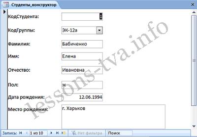 Рис. 9. 5. Перемещение полей и их имен по форме производиться следующим образом: Выделить поле с именем щелчком мыши. Вокруг него появятся маркеры перемещения и изменения размеров. Перемещать поле можно вместе с привязанным к нему именем или отдельно от него. Для перемещения поместить указатель мыши на квадратик, находящийся в левом верхнем углу элемента. Указатель мыши в виде четырех направленной стрелки позволяет перемещать объект. Нажать кнопку мыши и, удерживая ее, буксировать поле или его имя в нужное место в форме. Затем отпустить кнопку мыши. Для изменения надписи, связанной с полем необходимо выполнить на ней двойной щелчок мышью и выполнить необходимые изменения. Затем закрыть окно. Для изменения размеров поместить курсор на размерные маркеры, при этом курсор примет вид двунаправленной стрелки. Нажать кнопку мыши, буксировать в нужном направлении, затем отпустить кнопку мыши. Для удаления поля выделить его, нажать клавишу Delete или другим способом. 6. Сохранить форму. 7. Просмотреть форму Студенты_конструктор, выполнив на ней двойной щелчок в области переходов.