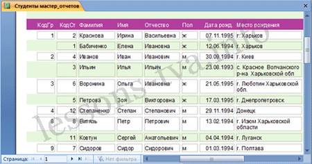 Рис. 2. Все "Доступные поля" переведем в "Выбранные поля", выделив их и щелкнув на кнопку >>. На следующем шаге (Добавить уровни группировки?) щелкаем далее. На шаге "Выберите порядок сортировки записей". В раскрывающемся списке выберем "Фамилия" для сортировки по возрастанию. На шаге "Выберите вид макета для отчета". Выбираем: Макет - блок, ориентация - книжная. Щелкнуть на кнопке Далее. На шаге " Выберите требуемый стиль". Выбираем - Изящная. Следующий шаг - "Задайте имя отчета". Вводим имя - Студенты мастер_отчетов. Дальнейшие действия: Просмотреть report; Изменить макет отчета. Выбираем Просмотреть, щелкаем на кнопке Готово. Report открывается в режиме Предварительного просмотра, который позволяет увидеть, как будет выглядеть report в распечатанном виде.
