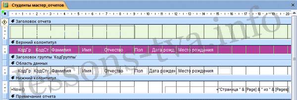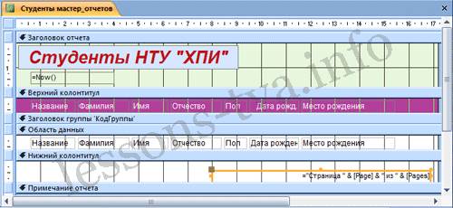 Рис. 4. Редактирование: 1) удалите поля КодСтудента в верхнем колонтитуле и области данных; 2) удалите поля КодГруппы в верхнем колонтитуле и области данных; 3) На место поля КодГруппы переместить поле "Название" из списка "Группы студентов"; 4) переместите влево все поля в верхнем колонтитуле и области данных. 5) Измените надпись в заголовке страницы, введите НТУ «ХПИ» и нажмите Enter. 6) Переместите Надпись. В Нижнем колонтитуле выделить поле =Now() и перетащить его в Заголовок под название Студенты. Дата будет отображаться под заголовком. Форматирование: 1) Выделите заголовок Студенты НТУ «ХПИ» 2) Измените гарнитуру, начертание и цвет шрифта, а также цвет заливки фона. Report в режиме конструктора примет вид, представленный на рисунке 5.