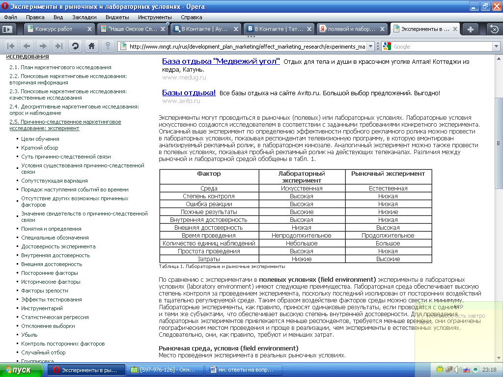 Эксперимент (от лат. experimentum — проба, опыт) в научном методе — метод исследования некоторого явления в управляемых условиях. Отличается от наблюдения активным взаимодействием с изучаемым объектом. Обычно эксперимент проводится в рамках научного исследования и служит для проверки гипотезы, установления причинных связей между феноменами. Лабораторный эксперимент (англ. laboratory experiment), или искусственный эксперимент, — в это вид эксперимента, который проводится в искусственно созданных условиях (в рамках научной лаборатории) и в котором по мере возможности обеспечивается взаимодействие исследуемых субъектов только с теми факторами, которые интересуют экспериментатора. Исследуемыми субъектами считаются испытуемые или группа испытуемых, а интересующие исследователя факторы называются релевантными стимулами. Естественный эксперимент, или полевой эксперимент, — это вид эксперимента, который проводится в условиях обычной жизнедеятельности испытуемого с минимумом вмешательства экспериментатора в этот процесс. При проведении полевого эксперимента сохраняется возможность, если это позволяют этические и организационные соображения, оставить испытуемого в неведении о своей роли и участии в эксперименте, что имеет преимущество в том, что на естественность поведения испытуемого не скажется факт проведения исследования. Эксперименты могут проводиться в рыночных (полевых) или лабораторных условиях. Лабораторные условия искусственно создаются исследователем в соответствии с заданными требованиями конкретного эксперимента. Различия между рыночной и лабораторной средой обобщены в табл. 1.