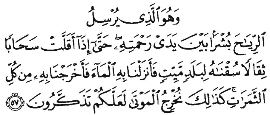 Он - Тот, Кто направляет ветры добрыми вестниками Своей милости. Когда же они приносят тяжелые облака, Мы пригоняем их к мертвой земле, проливаем воду и посредством этого взращиваем всевозможные плоды. Таким же образом Мы воскрешаем мертвых. Быть может, вы помяните назидание. [Аль А’раф (7):57],далее в следующем аяте, говорится: «На хорошей земле растения растут по воле ее Господа, а на плохой земле они растут с трудом». (7:57). Посланник Аллаха, да благословит его Аллах и приветствует, четко объяснил нам эту притчу в Хадисе собранном Имамом Бухари и Имамом Муслимом, где говорится: «Передают со слов Абу Мусы аль-Аш'ари, да будет доволен им Аллах, что Пророк, да благословит его Аллах и приветствует, сказал: «Поистине, руководство и знание, с которыми Всемогущий и Великий Аллах послал меня [к людям], подобны выпавшему на землю дождю. Часть этой земли была [плодородной], впитала в себя воду и породила много [всяких] растений и трав. [Ещё одна часть] её была плотной и задержала [на себе] воду, Аллах же обратил её на пользу людям, которые стали употреблять эту воду для питья, поить [ею скот] и использовать её для орошения. [Дождь] выпал и на другую часть земли, представлявшую собой равнину, которая не задержала воду и не породила [никаких] растений. [Эти части земли] подобны тому, кто постиг религию Аллаха, обратившего ему на пользу то, с чем Он послал меня, [благодаря чему человек] сам приобрёл знание и передал его [другим], и тому, кто не обратился к этому сам и не принял руководство Аллаха, с которым я был послан» [68]. «Он несет мрак[полная темнота]» (2:19) «Он несет мрак[полная темнота]» (2:19), Аллах привел притчу в этом аяте, относительно сомнений и подозрений, которыми поражены лицемеры по отношению к Корану – Он сравнил это темноте грозовых туч, которые в первую очередь были приведены в сравнение с Кораном. Аллах пояснил нам многочисленные случаи, например, в другом аяте говорится, что тьма увеличивает их слепоту. Он говорит: