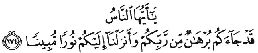 О люди! К вам уже явилось доказательство от вашего Господа, и Мы ниспослали вам ясный свет. [Ан Ниса (4):174]
