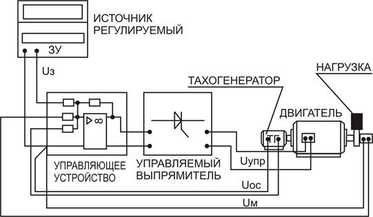 Управляющим устройством является суммирующий усилитель. Выходное напряжение усилителя ограничено величиной 12 В. Коэффициент усиления усилителя Ку может быть установлен в пределах от 1 до 10. Выход усилителя подключен ко входу управляемого выпрямителя.