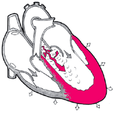 Недостаточность аортального клапана (схема). Показана регургитации крови из аорты в левый желудочек во время диастолы, выраженная эксентрическая гипертрофия левого желудочка.