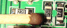 Три резистора разных номиналов для поверхностного монтажа (SMD), припаянные на печатную плату. Резисторы являются элементами электронной аппаратуры и могут применяться как дискретные компоненты или как составные части интегральных микросхем. Дискретные резисторы классифицируются по назначению, виду ВАХ, по способу защиты и по способу монтажа, характеру изменения сопротивления, технологии изготовления. По назначению: · резисторы общего назначения; · резисторы специального назначения: · высокоомные (сопротивления от десятка МОм до единиц ТОм, рабочие напряжения 100..400 В); · высоковольтные (рабочие напряжения — десятки кВ); · высокочастотные (имеют малые собственные индуктивности и ёмкости, рабочие частоты до сотен МГц); · прецизионные и сверхпрецизионные (повышенная точность, допуск 0,001 — 1 %). По характеру изменения сопротивления: