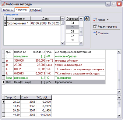Рабочая тетрадь состоит из трех связанных частей: Таблицы – в ней сосредоточены значения измеряемых величин и результаты расчетов, полученных из измеренных данных; Формулы – здесь располагаются формулы, необходимые для расчетов; их можно добавлять, удалять и редактировать; Графики – здесь сосредоточены графики, построенные как по измеренным данным, так и по результатам расчетов; их также можно добавлять, удалять и редактировать. Переключаться между частями рабочей тетради можно при помощи ярлычков, расположенных в верхней части окна.