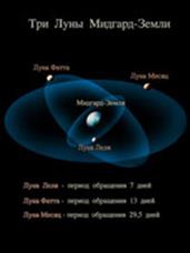 Одним из свидетельств наличия трёх лун у Мидгард-Земли, является т.н. «Небесный Диск» – бронзовый диск, найденный в 1999 году в окрестностях немецкого города Небра. Немецкие учёные считают, что Диску около 3600 лет и долго теряются в догадках, пытаясь определить функцию этого предмета. В конце концов Диску приписали функцию «комплексных, астрономических часов, сочетающих солнечный и лунный календарь». Правда, честно предупредили, что «Функция этих часов, по всей вероятности, была известна лишь небольшой группе». Между тем, если знать, что наша планета ещё не так давно имела 3 луны, то всё быстро становится на свои места. Сразу становится понятно, что именно изображено на Диске: на нём изображена Мидгард-Земля, а не Солнце, и 3 её спутника – Леля, Фатта и Месяц. И, что ещё интересно – такую картинку можно было увидеть только из Космоса и не позже, чем 113 000 лет тому назад (на 2009 год). Кстати сказать, наша последняя луна – Месяц – является искусственным объектом, чему есть несколько неоспоримых свидетельств. Вполне возможно, что и уничтоженные ранее луны Леля и Фатта тоже были искусственного происхождения. Во всяком случае, факт наличия возле Мидгард-Земли трёх лун говорит о длительном периоде подготовки к заселению планеты. Статья с www.derus.net