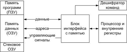 Принстонский университет разработал компьютер с общей памятью для хранения программ и данных. Блок интерфейса с памятью выполняет арбитраж запросов к памяти, обеспечивая выборку команд, чтение и запись данных, размещаемых в памяти или внутренних регистрах. Может показаться, что блок интерфейса является наиболее узким местом между процессором и памятью, так как одновременно с данными требуется выбирать из памяти очередную команду. Однако эта проблема решается предварительной выборкой. Основное преимущество принстонской архитектуры – то, что она упрощает устройство МП, так как реализует обращение только к одной общей памяти Гарвардская архитектура МК: