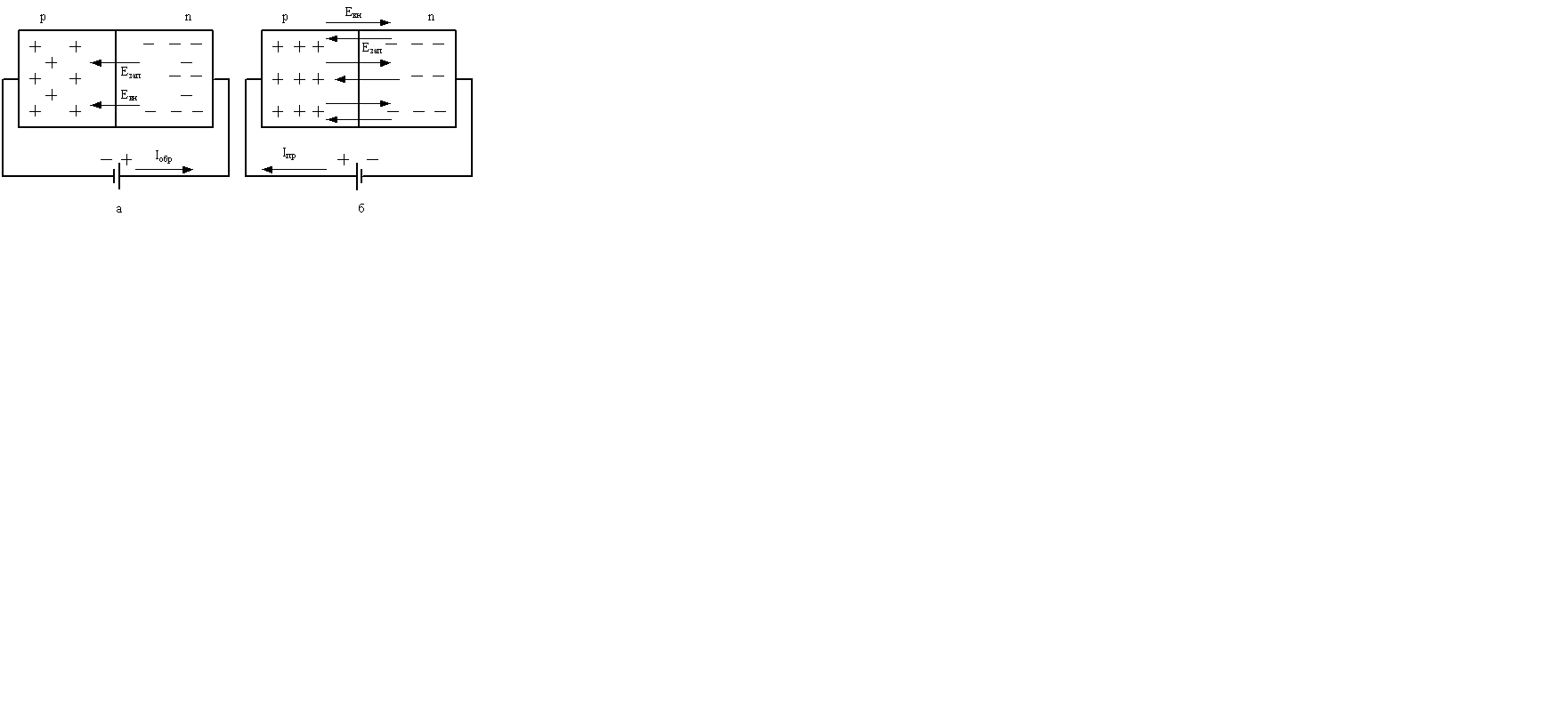 Однако при движении через p-n-переход неосновных носителей (так называемого дрейфового тока Iдр) происходит снижение ∆φк, что позволяет некоторой части основных носителей, обладающих достаточной энергией, преодолеть барьер. Появляется диффузионный ток Iдиф, который направлен навстречу дрейфовому Iдр, т. е. возникает динамическое равновесие, при котором Iдр = Iдиф. Если к p-n-переходу приложить внешнее напряжение, которое создает в запирающем слое электрическое поле напряженностью Евн, совпадающее по направлению с полем неподвижных ионов напряженностью Езап (рис. 2, а), то это приведет к расширению запирающего слоя, так как отведет от контактной зоны и положительные, и отрицательные носители заряда (дырки и электроны). При этом сопротивление p-n-перехода велико, а ток, проходящий через него, мал, так как он обусловлен движением неосновных носителей заряда. В этом случае ток называется обратным, а p-n-переход – закрытым.