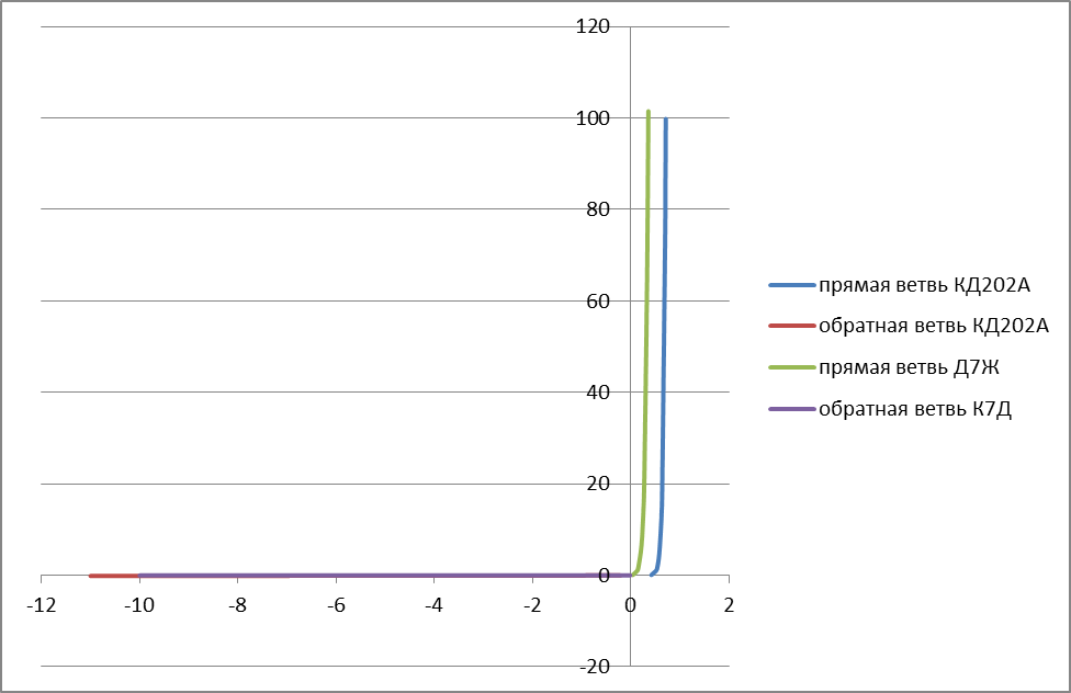 Рис. 4. ВАХ диодов Д7Ж и КД202А