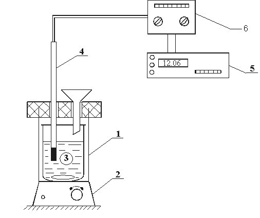 Методика проведения опытов Для определения интегральной теплоты растворения используется простейший калориметр, состоящий из внутреннего 3 (рис. 6) и наружного стакана 1. Сверху стаканы закрыты крышкой из материала с малой теплопроводностью. В крышке имеются два отверстия: одно для воронки, через которую засыпают навеску соли, через второе в термостат вводится термопарный датчик 4 (он позволяет находить изменение температуры в процессе растворения соли). Перемешивание жидкости в стакане 3 осуществляется магнитной мешалкой 2. Величины ЭДС датчиков регистрируются цифровым вольтметром 5. Показания последнего заносятся в таблицу первичной информации «