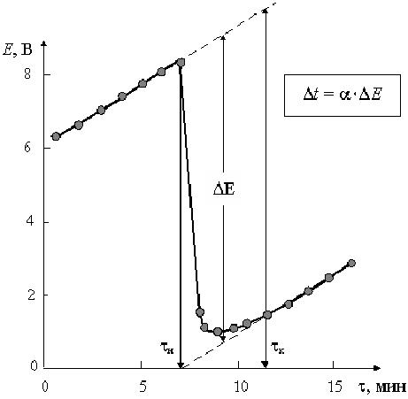 Рис.7. Зависимость E от времени наблюдения. По изменению ЭДС – Δ E находят Δ t Найденные опытным путем теплоты растворения солей вносят в таблицу 4 и оценивают абсолютную и относительную погрешности их определения, сопоставляя полученные результаты с табличными данными, приведенными в прил. 3 настоящего руководства. Таблица 4
