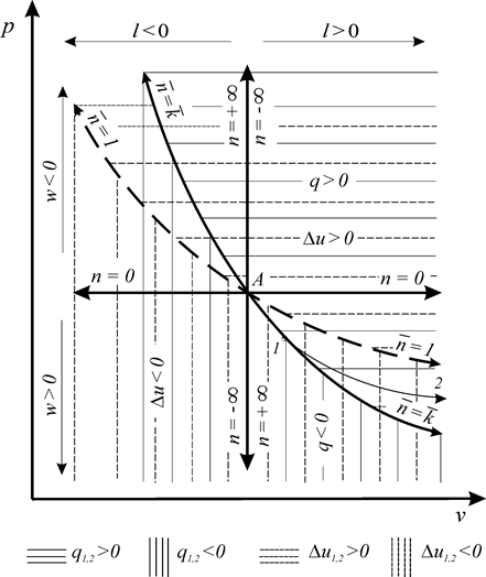 Полученные соотношения (120), (121) позволяют в координатах p - v построить области подвода и отвода теплоты (рис. 9).