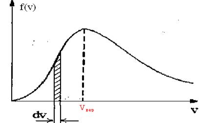 На рисунке представлен график функции распределения молекул идеального газа по скоростям (распределение Максвелла), где f(v)=(dN/dv)/N – доля молекул, скорости которых заключены в интервале скоростей от v до v+dv в расчете на единицу этого интервала.