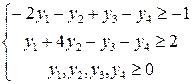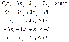 Цены ресурсов y1, y2, y3 называются учетными, неявными, теневыми. Смысл этих названий состоит в том, что это условные, “ненастоящие” цены. В отличие от “внешних” цен C1, C2 на продукцию, известных, как правило, до начала производства, цены ресурсов y1, y2, y3 являются внутренними, так как они задаются не извне, а определяются непосредственно в результате решения задачи, поэтому их часто называют оценками ресурсов. Формулировка двойственной задачи Найти такой набор оценок ресурсов, при которых общие затраты на ресурсы будут минимальными при условии, что затраты на ресурсы при производстве каждого вида продукции будут не менее выручки от реализации этой продукции. Свойства взаимно двойственных задач 1. В одной задаче ищут максимум целевой функции, а в другой минимум. 2. Коэффициенты при переменных в целевой функции одной задачи являются свободными членами системы ограничений в другой. 3. Каждая из задач задана в стандартной форме, причем в задаче на максимум все неравенства вида ”≤”, а в задаче на минимум – все неравенства вида “≥”. 4. Матрицы коэффициентов при переменных в системах ограничений являются транспонированными друг к другу. 5. Число неравенств в системе ограничений одной задачи совпадает с числом переменных в другой задаче. 6. Условия неотрицательности переменных имеются в обеих задачах. Пример решения задачи. Составить двойственную задачу для заданной. Дана целевая функция f(x)= –х1 + 2х2 → max И система ограничений: Приведем систему неравенств к правильному виду, чтобы все знаки неравенств соответствовали задаче на максимум: