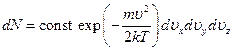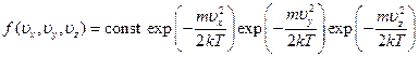 [Существенно, что ускорение силы тяжести в эту формулу не вошло. Так и должно быть, поскольку механизм установления распределения молекул газа по скоростям заключается в столкновениях молекул друг с другом и не имеет отношения к внешнему полю. Последнее играло в выводе лишь вспомогательную роль: введение этого поля, позволило связать распределение по скоростям с известной формулой Больцмана.] Полученное равновесное распределение молекул по значениям одной отдельной компоненты их скорости позволяет найти долю молекул, обладающих определенными значениями всех трех компонент скорости одновременно. Она получится, очевидно, перемножением долей молекул, обладающих определенными значениями каждой из компонент в отдельности. Другими словами, полная функция распределения имеет вид