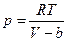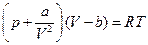 По мере увеличения плотности газа его свойства все более отклоняются от свойств идеального газа и, в конце концов, наступает его конденсация в жидкость. Эти явления связаны со сложными молекулярными взаимодействиями, и нет способа, которым можно было бы учесть эти взаимодействия количественным образом, с тем, чтобы теоретически построить точное уравнение состояния вещества. Можно, однако, построить уравнение состояния, учитывающее основные качественные особенности молекулярного взаимодействия. Характер взаимодействия молекул. Быстро возрастающие на малых расстояниях силы отталкивания. Их наличие означает, грубо говоря, что молекулы занимают некоторый определенный объем, дальше которого газ не может быть сжат. Другое основное свойство взаимодействия заключается в притяжении на больших расстояниях. Это притяжение очень существенно, поскольку именно оно приводит к конденсации газа в жидкость. Эти моменты можно учесть в уравнении состояния (для одного моля вещества). Учет ограниченной сжимаемости газа. Для этого надо в уравнении идеального газа p = RT/V заменить объем V разностью V–b, где b – некоторая положительная постоянная, учитывающая размеры молекул. Уравнение