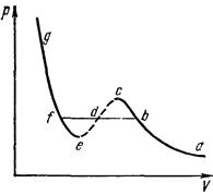 На рис. 8 изображена одна из таких изотерм. Следует выяснить, какой смысл имеют различные ее участки. На участках ge и са зависимость давления от объема имеет нормальный характер – давление возрастает при уменьшении объема. Участок же се соответствовал бы неестественному положению, когда сжатие вещества приводило бы к уменьшению давления. Однако, такие состояния вообще не могут осуществляться в природе. Действительно, пусть существует вещество с такими свойствами и пусть какой-либо маленький участок его случайно сжался, хотя бы в результате флуктуации. Тогда его давление тоже уменьшится, т. е. станет меньше давления окружающей среды, что в свою очередь вызовет дальнейшее сжатие и т. д., т. е. данный маленький участок будет продолжать сжиматься с возрастающей скоростью. Это значит, что рассматриваемые состояния вещества были бы совершенно неустойчивыми и потому не могут быть осуществлены в действительности. Наличие заведомо неосуществимого участка ее изотермы означает, что при постепенном изменении объема вещество не может оставаться все время в виде однородной среды. В некотором диапазоне объемов должно наступить скачкообразное изменение состояния, то есть распадение вещества на две фазы. Другими словами, истинная изотерма будет иметь вид ломаной линии аbfg. Часть ее ab отвечает газообразному состоянию вещества, а часть fg – жидкому состоянию. Горизонтальный же прямолинейный отрезок bf соответствует двухфазным состояниям – переходу газа в жидкость, происходящему (при заданной температуре) при определенном постоянном давлении. Что касается участков изотермы bс и ef, то они отвечают так называемым метастабильным состояниям – переохлажденному пару и перегретой жидкости. Теперь видно, что существуют определенные границы (изображаемые точками с и е), дальше которых переохлаждение пара или перегрев жидкости вообще невозможны. При повышении температуры прямолинейный участок изотермы уменьшается и при критической температуре стягивается в одну точку (точка К на рис. 7). Проходящая через эту точку изотерма 3 разделяет изотермы обоих типов: монотонные изотермы 1, 2 и изотермы 4, 5, 6 с минимумами и максимумами, на которых неизбежно распадение вещества на две фазы. Если соединить между собой точки начала и конца прямолинейных отрезков изотерм (кривая а на рис. 7), то получающаяся кривая представит собой кривую фазового равновесия жидкости и пара на диаграмме р, V. Максимум К этой кривой есть критическая точка. Соединение точек, подобных точкам с и е на рис. 8, дает кривую (кривая б на рис. 7), ограничивающую область, в которой неразделенное на фазы вещество не может существовать даже в метастабильном состоянии. В критической точке сливаются в одну три точки, в которых прямолинейный участок пересекает изотерму Ван-дер-Ваальса. Отсюда следует, что касательная к изотерме в критической точке имеет горизонтальное направление, т. е. обращается в нуль производная от давления по объему (при постоянной температуре)