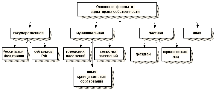 Гражданский кодекс РФ в соответствии с Конституцией РФ предусмотрел три основные формы права собственности: право частной собственности, право государственной собственности право муниципальной собственности. Право частной собственности – это право на вещи частных (отдельных) лиц, удовлетворяющих их индивидуальные (частные) интересы, а не публичные (общие). Согласно ст. 35 Конституции РФ право частной собственности охраняется законом. Каждый вправе иметь имущество в собственности, владеть, пользоваться и распоряжаться им как единолично, так и совместно с другими лицами. Никто не может быть лишён своего имущества иначе как по решению суда. Принудительное отчуждение имущества для государственных нужд может быть произведено только при условии предварительного и равноценного возмещения. Субъектами частной собственности могут быть физические и юридические лица. Объектами права частной собственности может быть любое имущество, допускаемое в гражданском обороте. Частная собственность не ограничивается количеством объектов одного вида. Допускается использование частной собственности с целью извлечения прибыли. Не запрещено применять к объектам частной собственности наемный труд. Право государственной собственности – это право собственности государственных образований. Субъекты государственной собственности – это Российская федерация и все её субъекты. Объектом государственной собственности может быть любое имущество. Есть объекты исключительной собственности государства. Они могут принадлежать только государству (недра, лесной фонд, водные ресурсы и др.). Право муниципальной собственности – это право принадлежащее муниципальным образованиям (городам, сельским и иным поселениям). Объектами муниципальной собственности являются имущество местных органов власти, средства местного бюджета, жилищный фонд, объекты инфраструктуры и др. Особая разновидность права собственности – право общей собственности. Право общей собственности – это право двух или нескольких лиц на одну вещь (несколько вещей). Право общей собственности может объединять субъектов всех допускаемых законом форм собственности (физических и юридических лиц – частных собственников с субъектами государственной и муниципальной собственности). Право общей собственности подразделяется на права долевой и совместной собственности. Право долевой общей собственности закрепляет за каждым собственником право на долю в общей собственности (в её стоимости). Доли могут быть равными и не равными. Право совместной собственности закрепляет бездолевую собственность. Доли собственников определяются в ней лишь при разделе общей собственности. К совместной собственности относятся собственность супругов, собственность фермерского хозяйства, если иное не установлено соглашением сторон.