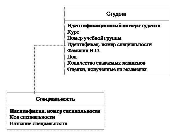 Обсудим значения атрибута «идентификационный номер специальности» сущности «Студент». Значения этого атрибута ассоциируют каждый экземпляр сущности «Студент» с одним из экземпляров сущности «Специальность». Значение атрибута «идентификационный номер специальности» в сущности «Студент» обеспечивает связь сущности «Специальность» с сущностью «Студент» в отношении «один – много». Одну и ту же специальность могут получать много студентов, но информация о специальности заполняется только один раз, что позволяет избежать дублирования информации о специальности при её хранении.
