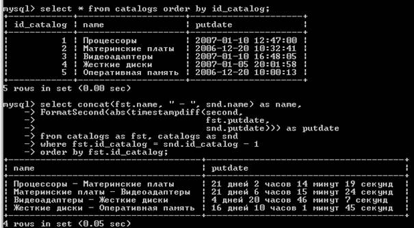 Далее представлен более сложный пример – вычисляется разница между правками отдельных элементов каталога, и это достигается при помощи самообъединения таблицы catalogs. Для удобства таблица сортируется по первичному ключу id_catalog, и разница в правке вычисляется для двух соседних позиций.