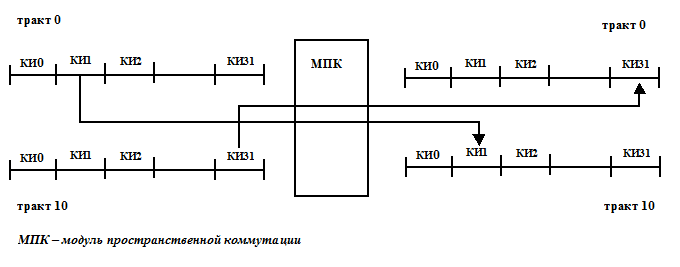 Для реализации функций пространственной коммутации используются модули пространственной коммутации МПК. На рисунке показано, что информация из 0 входящего тракта передается в 10 исходящий тракт в первом канальном интервале КИ1, а информация из 10 входящего тракта передается в 0 исходящий тракт в 31 канальном интервале КИ31: