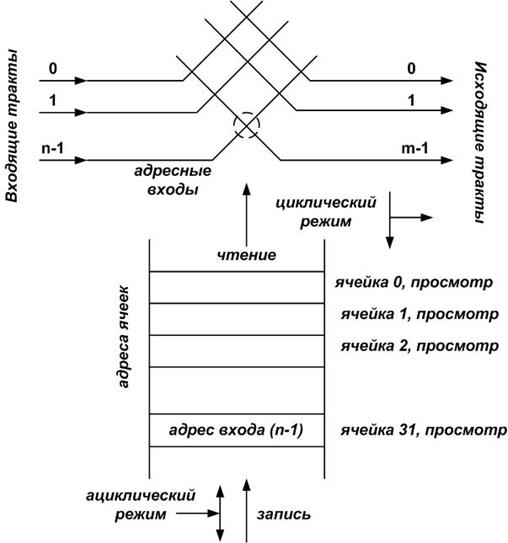 При аналоговой коммутации каналов используются пространственные коммутационные схемы. При этом каждая точка коммутации закрепляется за определенным соединением на весь период его существования. Коммутация с временным разделением предполагает совместное использование точек коммутации путем разделения времени на интервалы, которые повторяются циклически. В каждом интервале отдельные конкретные точки коммутации и соответствующие им промежуточные соединительные линии периодически закрепляются за существующими соединениями. Пространственная коммутация – это коммутация одноименных каналов разных трактов, при которой процесс приема и передачи информации из входящего тракта в исходящий осуществляется в одном временном интервале.