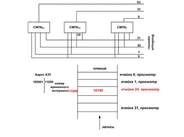 Управляющее устройство, произведя выбор временного канала 24, в режиме ациклической записи заполняет ячейку адресного ЗУ адресом 20 входящего тракта. Ячейки АЗУ просматриваются УУ в режиме последовательного чтения. Когда при очередном опросе в ячейке АЗУ обнаруживается адрес 20 входящего тракта, то он считывается и подается на 33 мультиплексор. За время 24временного канала из тракта приема в тракт передачи будет передано 8 бит информации.