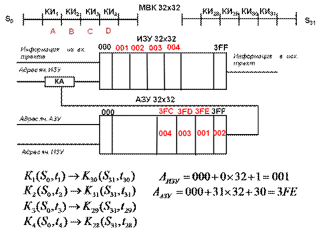 УУ после определения адреса исходящего канала для дальнейшего установления соединения в режиме произвольной записи вносит в ячейку АЗУ этого канала адрес ячейки ИЗУ, с которыми производится коммутация. Ячейки ИЗУ заполняются информацией из входящих трактов в режиме последовательной записи. Ячейки АЗУ просматриваются УУ в режиме последовательного чтения. Если при обращении к ячейке АЗУ в ней обнаруживается адрес ячейки ИЗУ, то по этому адресу происходит обращение и содержимое ячейки ИЗУ передается в исходящий тракт (8 бит). Перенос информации будет происходит до тех пор, пока из ячейки АЗУ не будет стерт адрес ячейки ИЗУ.