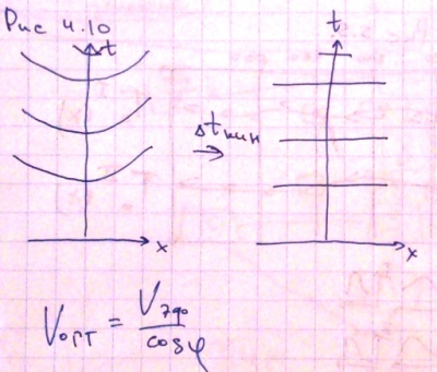 Кинематические поправки (NMO) Кинематические поправки рассчитываются по формуле 4.4. Рис 4.8. – нормальный годограф – это годограф от горизонтальной границы. Для ввода кинематических поправок нужно знать закон распределения скоростей со временем, рис 4.9. Все спрямляем, рис 4.10. Остается вопрос: какую скорость использовать в СР.