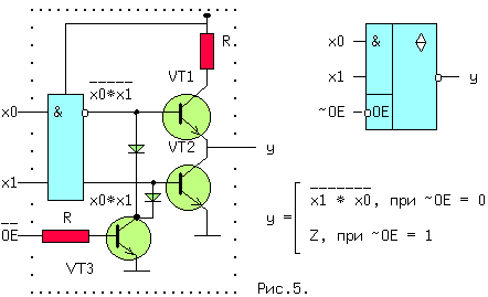 Наряду с двумя логическими состояниями существует третье технологическое состояние, когда выход элемента отключается от внутренней схемы. При этом сопротивление между выходом и "землей" становится очень большим и выход микросхемы не оказывает никакого влияния на подключенные к нему выходы других микросхем. Такое включение, разновидность "монтажного И", применяется там, где несколько источников сигналов по очереди подключаются к входам одного или нескольких приемников, не мешая друг другу. Третье состояние называют также высокоимпедансным или Z - состоянием. Схема И-НЕ с Z-состоянием выхода приведена на рис.5. слева, а ее условное обозначение - справа.