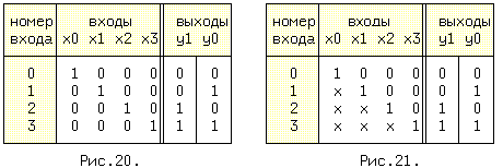 В приоритетном Ш производится преобразование максимального десятичного номера активного входа в двоичный эквивалент этого номера. Для такого Ш входные сигналы, лежащие снизу от единичной диагонали, по определению не известны ("x" может быть 0 или 1). Следовательно полная таблица истинности, вместо нижних трех строчек должна содержать еще 2+4+8=14 строк см. рис.21. Комбинация 0000 на входах не определена.