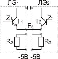 3) строка таблицы номер 3 аналогична второй; 4) Z1:= 1; Z2:= 1; т.е. Uб1 = -1,6В, Uб2 = -1,6В, тогда оба транзистора открыты и на выходе будет F≈ -1,6В:=1. Из табл. 2.11 следует, что объединение выходов двух логических элементов реализует F = Z1& Z2 . На рис.2.25 представлен пример объединения выходов двух логических элементов. Соответственно на общем выходе будет
