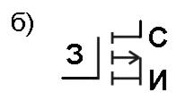 С-сток, И – исток, З -затвор Рис.2.26. УГО транзисторов типа а) р-МОП и б) n -МОП Существуют системы ЦЭ на полевых транзисторах, которые различаются по типу транзисторов, используемых в них: 1) используются только n–МОП - транзисторы; 2) используются только р-МОП - транзисторы; 3) используются n –МОП и р-МОП – комплиментарные или к-МОП- транзисторы. Транзисторы типа р-МОП открываются отрицательным уровнем напряжения на затворе по отношению к истоку, а транзисторы типа n –МОП - положительным уровнем напряжения. Принципиальная схема универсального логического элемента представлена на рис. 2.27. Эта схема пригодна для МОП - транзисторов с любым типом проводимости. Особенности схемы: 1) амплитуда логического сигнала равна амплитуде питающего напряжения, 2) наличие только непосредственных связей между элементами, 3) роль нагрузочных сопротивлений выполняют также МОП – транзисторы, находящиеся в определенном линейном режиме.