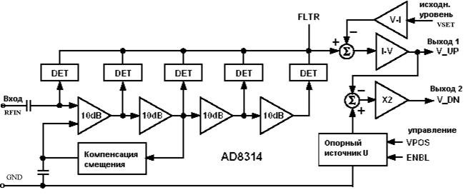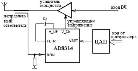 Внутренняя структура ИМС AD8314 (рис. 7.7.10) состоит из четырехкаскадного демодулирующего логарифмического усилителя и вспомогательных цепей. На выходе вырабатываются два постоянных напряжения, одно из которых возрастает (V_UP), а другое уменьшается (V_DN) от некоторого исходного уровня при увеличении амплитуды сигнала. Указанный исходный уровень напряжения может быть подан извне (вход VSET), что существенно упрощает схему регулирования выходной мощности передатчика. Пример цифровой схемы управления выходной мощностью передатчика с обратной связью на AD8314 показан на рис. 7.7.11.
