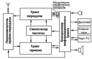 Наиболее обобщенная структурная схема приемопередатчика (трансивера) с контроллером информационного тракта приведена на рис.3.1.1. Она включает функции, перечисленные выше. Варианты внутренней структуры контроллера информационного тракта приведен на рис.3.1.2. Это упрощенная структура ИМС PCD87550 фирмы Филлипс, которая является контроллером информационного тракта цифровых радиопередатчиков системы беспроводной передачи данных «Bluetooth» (рис.3.1.2.а) и структурная схема baseband-контроллера AD6526, предназначенного для построения трансиверов стандартов GSM/GPRS (рис.3.1.2б). Вычислительным ядром этих контроллеров является специализированный процессор ARM TDMI, управляющий контроллером связи, который, в свою очередь, через радиоинтерфейс управляет работой трансивера, получает и передает через него данные. Под радиоинтерфейсом здесь имеется в виду схема сопряжения цифрового контроллера связи с аналоговой частью трансивера. Остальные блоки, показанные на рис.3.1.2а, особых пояснений не требуют: это кодек речи, ЦАП для управления режимами каскадов трансивера, внутренний тактовый генератор, память, интервальный таймер, а также богатый выбор интерфейсов для связи с периферийными устройствами (например, дисплеем, клавиатурой) и внешним управляющим компьютером. Контроллер AD6526 является более специализированным, поэтому в него введены такие блоки, как интерфейс SIM-карты, интерфейсы дисплея, клавиатуры и подсветки, часы реального времени и др. Его блоки можно разделить на три основные группы: подсистема управляющего микропроцессора (MCU), подсистема сигнального процессора (DSP), подсистема периферии.