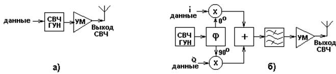 Для получения модулированных сигналов с рабочей частотой в радиопередатчиках с контроллерами информационного тракта используют несколько типов структурных схем радиочастотных трактов. Приведем здесь самые распространенные из них [7]. 1. Передатчики с прямой модуляцией и прямой квадратурной модуляцией характеризуются тем, что генератор, управляемый напряжением (ГУН) вырабатывает колебания с рабочей частотой передатчика (например, для системы DECT около1900 МГц, а для Bluetooth - 2.4 ГГц), а модуляция происходит путем воздействия на сам ГУН или его выходной сигнал. В передатчиках с прямой модуляцией (рис.3.1.3а) реализуются виды модуляции с постоянной огибающей, например, частотная манипуляция (N-FSK), а в передатчиках с прямой квадратурной модуляцией (рис.3.1.3б) возможно формирование любых узкополосных амплитудно-фазовых видов модуляции, например многопозиционной квадратурной амплитудной модуляции (N-QAM). Интегральные квадратурные СВЧ-модуляторы были рассмотрены в предыдущем разделе.