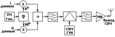 Прямая модуляция с удвоением частоты (рис.3.1.4б) не требует такого сложного фильтра, но могут возникнуть дополнительный фазовый шум и паразитная амплитудная модуляция, свойственные умножителям частоты. Все же, качество сигнала, обеспечиваемое прямой модуляцией с удвоением частоты, достаточно для устройств беспроводной связи стандарта DECT, и промышленностью выпускаются такие устройства (например, комплект ИМС для трансивера DECT: PMB2420, PMB2220, фирма Siemens). 3. Непрямая модуляция (модуляция с преобразованием частоты вверх) является наиболее популярной, так как позволяет реализовать все преимущества супергетеродинных передатчиков, в частности, спектральную чистоту сигнала и низкое энергопотребление квадратурного модулятора. Легко предотвратить затягивание частот гетеродина и просачивание его сигнала в антенну. Недостаток -трудность изготовления фильтров, а также необходимость генерирования двух частот генераторов.