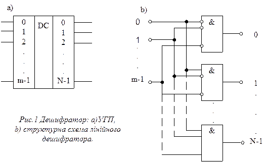 Дешифратор це комбінаційна схема, яка має m і N двійкових входів виходів відповідно, зв’язок між ними такий N £ 2m; на одному з виходів(назвемо його вибраним виходом) є сигнал “1”(“0”), на решту - “0”(“1”); вибраний вихід відповідає комбінації діючого двійкового вхідного сигналу.Дешифратор, що відповідає значенням вихідного сигналу, що подані в дужках, назвемо інверсним дешифратором. Дешифратори сучасних комп’ютерів - це інтегральні схеми, виконані на транзисторах.Вони бувають, в основному, лінійними, квадратичними та пірамідальними.